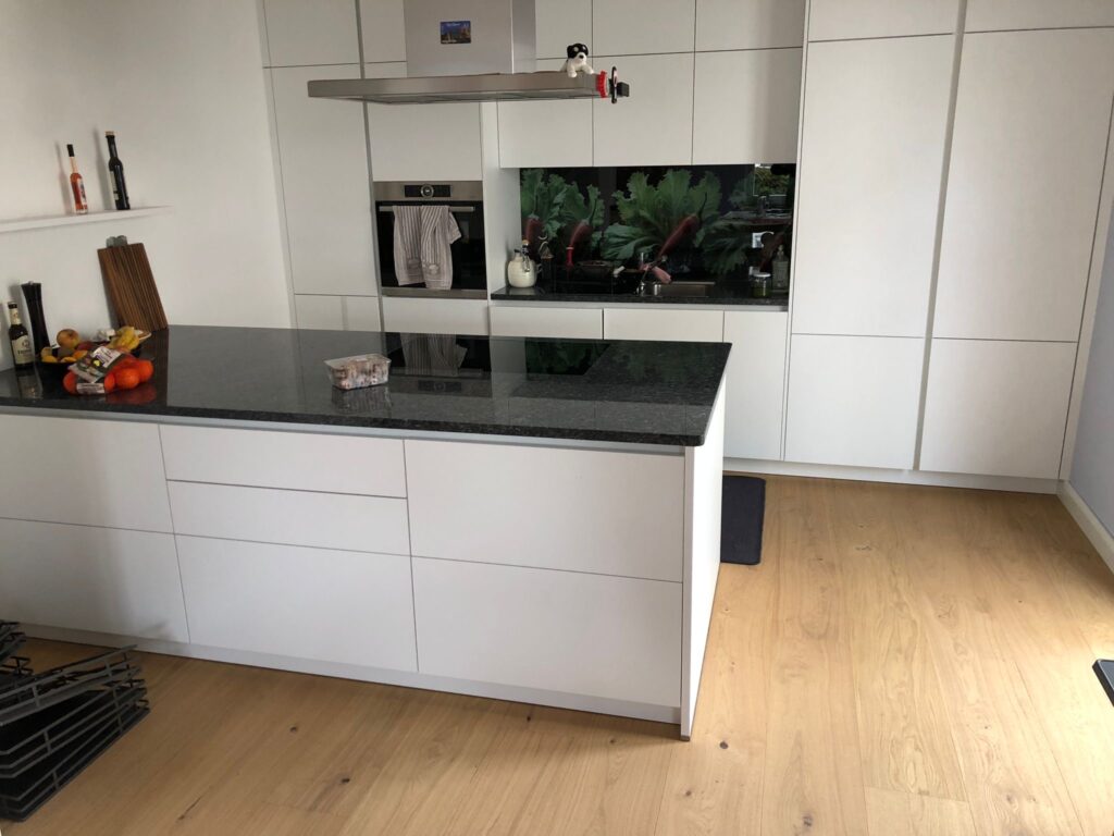 Insgesamt umfasste das Projekt das Entfernen von Böden, Fliesen, Türen und einer Wand inkl. Statikergutachten. Anschließend Sanitär-, Maler- und Elektroarbeiten. Boden wurde nivelliert, neuer Boden verlegt und neue Türen+Zargen verbaut.